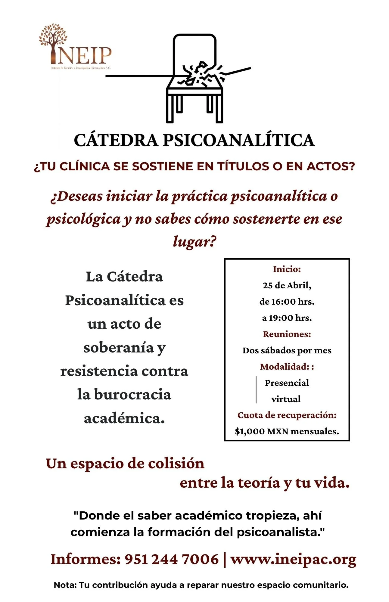 “Un acto de soberanía y resistencia contra la burocracia académica. Un espacio de colisión entre la teoría psicoanalítica y tu vida cotidiana.”